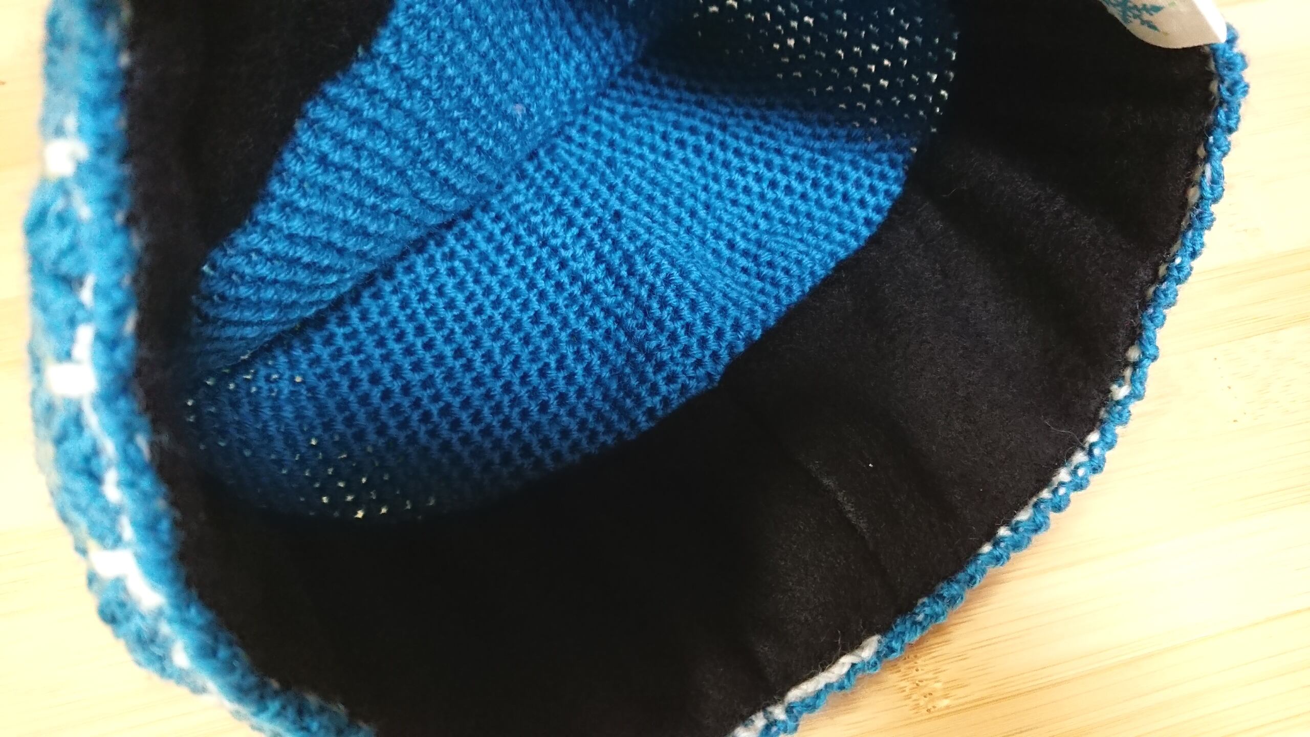 細めのウール100%の毛糸でしっかりと編んでいます。裏地はフリース生地。